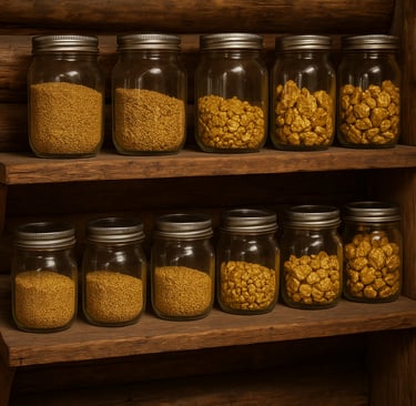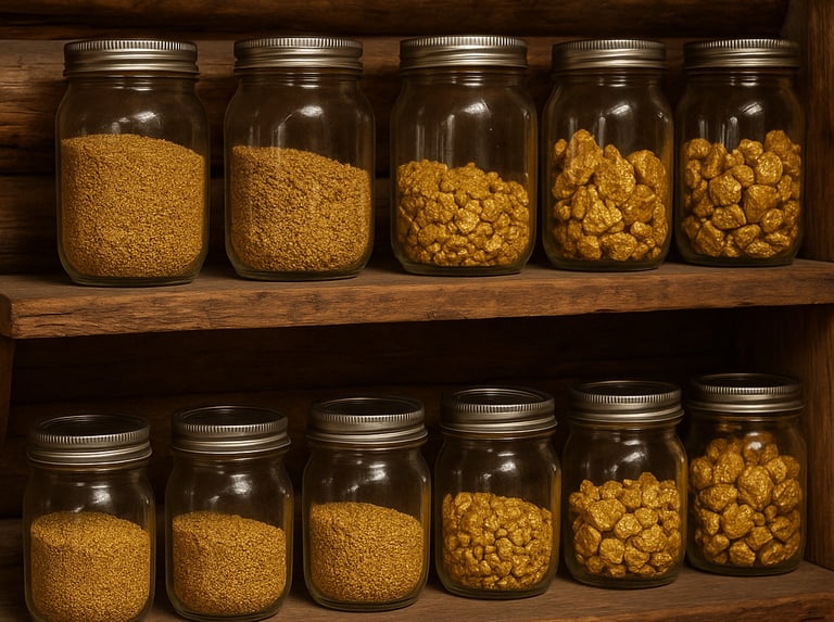 On the two top shelves were several clear glass containers, mostly canning jars of pint size, plus a couple smaller glasses, all but two of which were filled to the brim with pieces of raw gold, sorted roughly by size. The smallest flakes and “dust” were on the left, followed by larger flakes and “pickers” up to about pencil eraser size. Next were larger nuggets up to maybe thumbnail size, and finally a single jar with only three nuggets inside, each of which had to be at least three or four ounces each. I had read of such things in the Klondike but never dreamed of actually seeing it. Even with extensive experience in gold mining and assaying, this was more raw gold than I had ever seen at one time in my entire life!